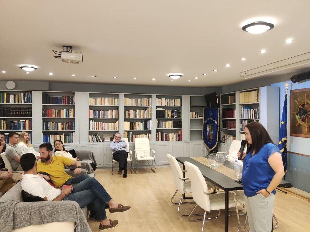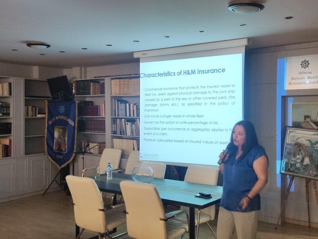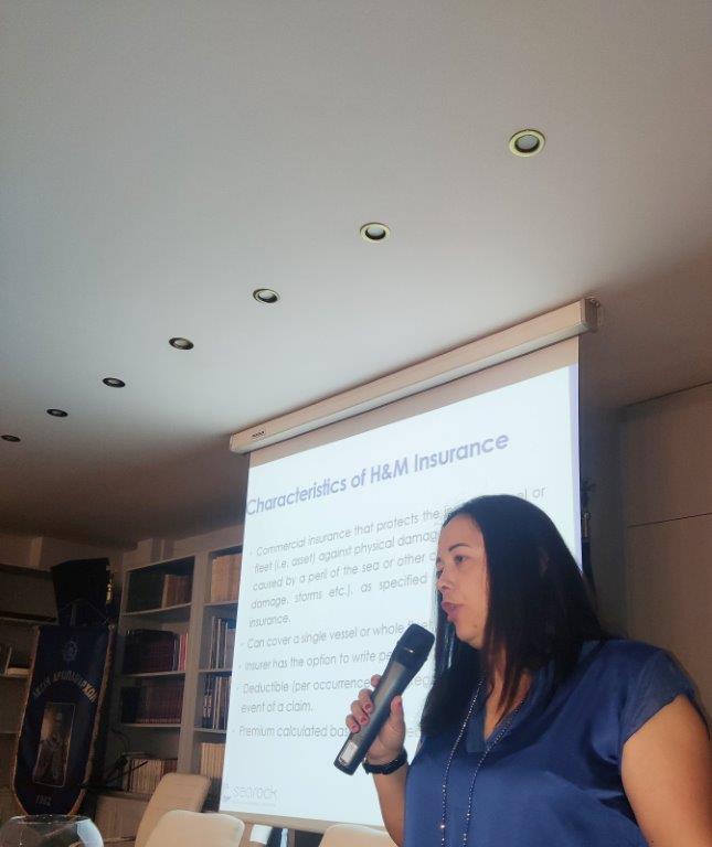 Την Πέμπτη 18 Απριλίου και ώρα 19:00, πραγματοποιήθηκε στα γραφεία της Λέσχης μας, ομιλία με θέμα «Aσφαλιστήρια Συμβόλαια (H+M & P+I)»,από την Κυρία Μαρία Μαυρουδή της SEAROCK, (η κα Μαυρουδή είναι από τα ιδρυτικά στελέχη και μέλος της WISTA).